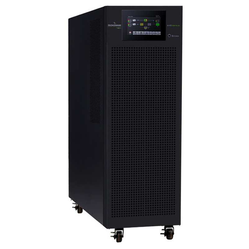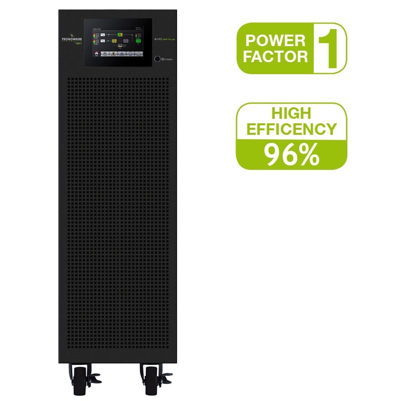UPS EVO DSP PLUS TT 10.0 PF 1 – Power 10KVA. On Line Technology (VFI) DSP, 96% Efficiency, Three-phase Input / Output 400Vac, 50 / 60Hz, dimensions 25×82,6×63 cm, weight 70 Kg, ready to install 20x 12V 7,2-9-11Ah internal batteries or extenal battery box (see the options).