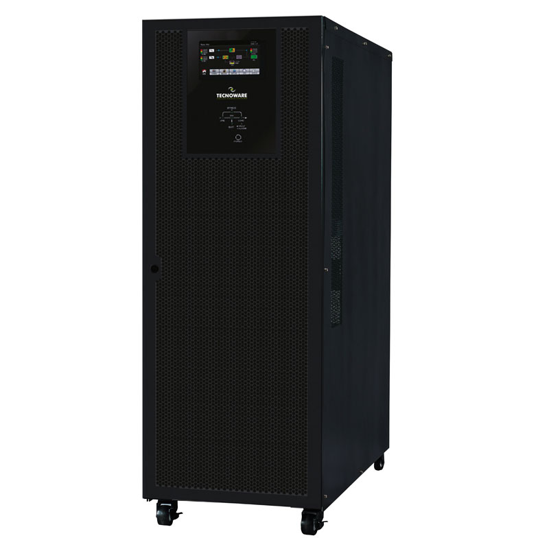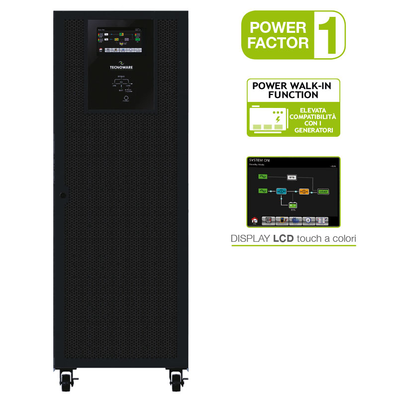 UPS EVO DSP PLUS TT 120.0 – Power 120 KVA PF 1. On Line Technology (VFI) DSP with Modular structure, Efficiency 96%, Input / Output 400Vac, 50 / 60Hz, dimensions 43x120x100 cm, weight 200 Kg,Easy internal modules Swap with redundant function, Power Walk-in when starting the rectifier, does not include batteries, extension bacup time through additional battery boxes. 10 “LCD display Multi-function graphic touch, static and manual bypass, EPO contact for emergency shutdown, USB and RS232 communication ports for UPS control and on / off programming via the free TecnoManager software. SNMP card, Dry Contact or MODBUS (optional).