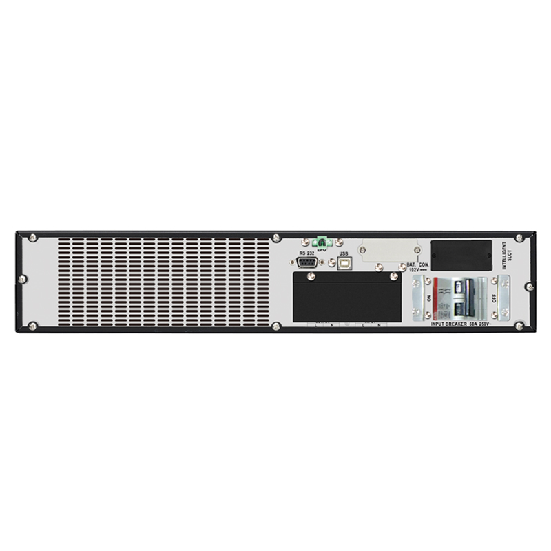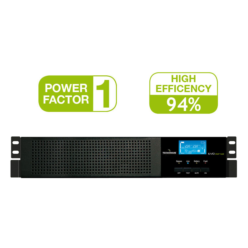 UPS EVO DSP PLUS RACK MOUNT 6.0 – Power 6 KVA PF 1. On Line Technology (VFI) DSP, 94% Efficiency, Input / output 230 / 230Vac 50 / 60Hz, dimensions 43.8×8.8×50 cm (2 Rack units), weight 15 Kg, does not include batteries, for bacup time add external battery boxes. Multifunction graphic LCD display, static bypass, EPO contact for emergency shutdown, USB and RS232 communication ports for UPS control and on / off programming via the free TecnoManager software. SNMP, Dry Contact or MODBUS card (optional).